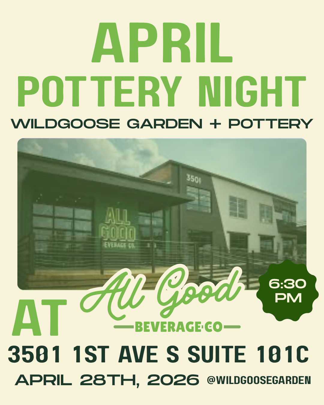 Back to All Events Pottery Night Tuesday, April 28, 2026 6:30 PM 8:30 PM ALL GOOD BEVERAGE CO 3501 1st Avenue South Birmingham, AL, 35222 United States (map) Google Calendar ICS GET MORE INFO HERE GET MORE INFO HERE 6:30-8:30pm inside the event room at All Good Beverage Co.